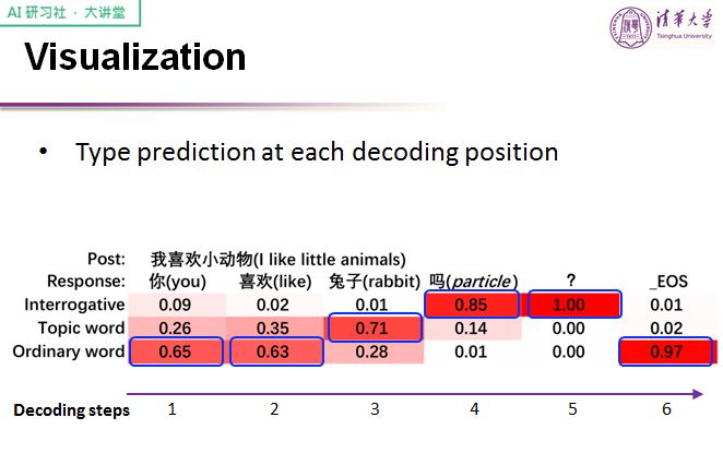 疑问词比较好确定,因为一共就那么几种提问方式;话题词的确定要稍微麻烦一点,在训练中,我们会将 response 里的所有名词和动词作为话题词训练,也就是将回复中的名词和动词所在对应词表的位置都标记为话题词。