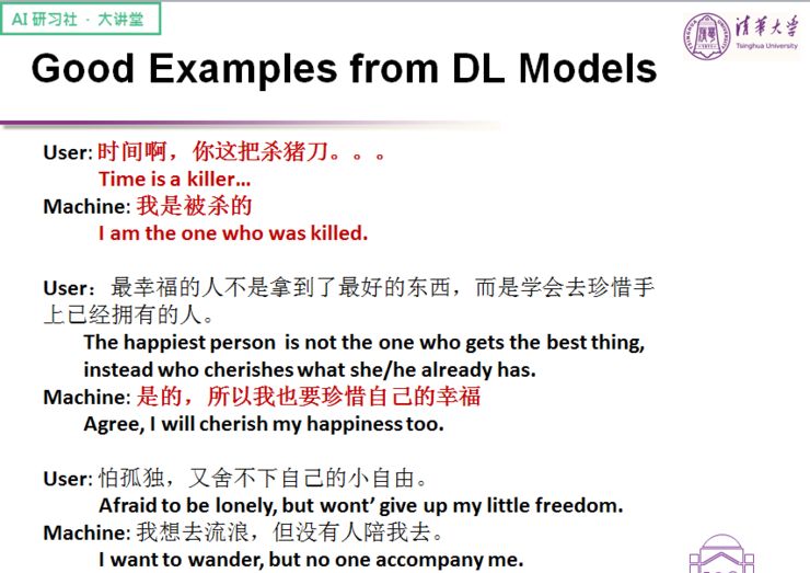 这是利用深度学习模型所训练出的一些比较好的结果。可以看出,机器学习生成方式具有一个很好的优点,就是具有一定的创新性的,不再局限于训练数据中的结果,而是基于生成模型来生成回复,因此回复往往富有创造力。