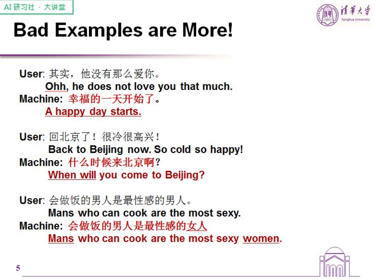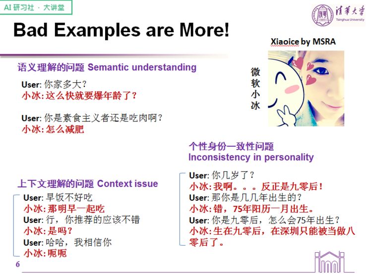 从更高层面来看,我们还发现了语义理解、上下文理解、个性身份一致性的问题。很多人在使用闲聊系统过程中发现,很多时候聊到一半便进行不下去,是因为机器人自己先把天聊死了。