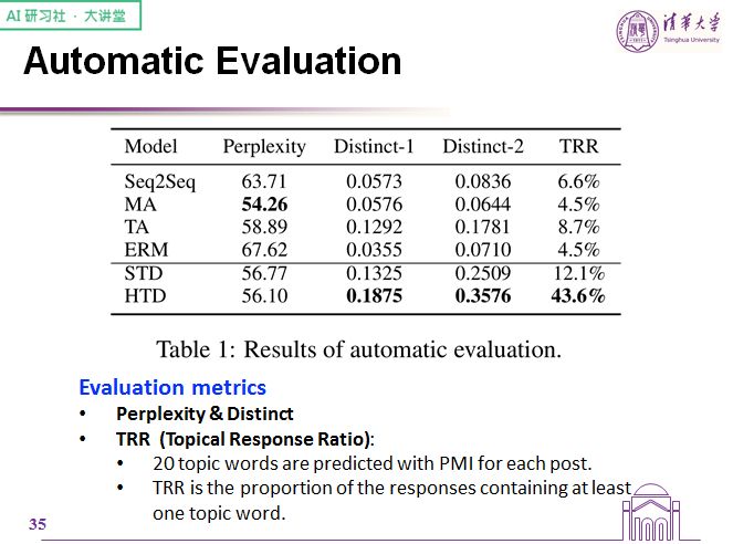 困惑度描述的是语法性问题,而 distinct-1 和 distinct-2 描述的是词汇的丰富性,至于 TRR 则是我们自己提出的指标,它表示话题词占到总回复的比例。总的来看,我们的模型在这些指标上都取得了很好的结果。