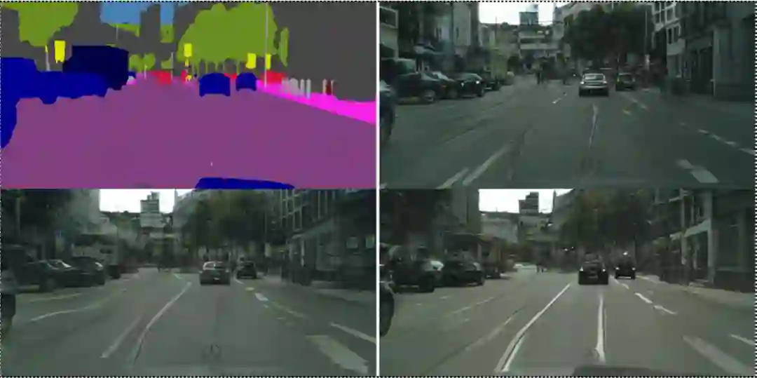 图 1:Cityscapes 结果。其中左上为输入图像、右上为 pix2pixHD 生成的图像、左下为 COVST 生成的图像、右下为本论文提出方法生成的图像。