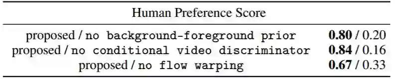 表 2:控制变量研究。作者对比了提出的方法和 3 个变体的性能。分别是初始 vs 无背景-前景先验;初始 vs 无条件视频判别器;初始 vs 无流扭曲。