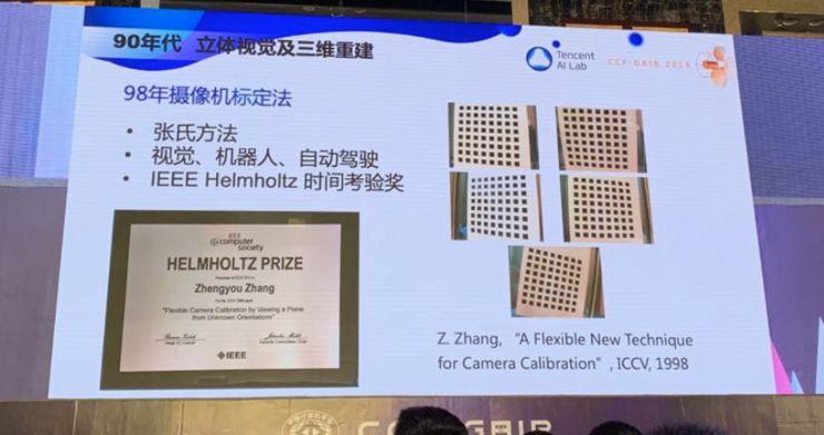 1998 年我提出了一个新的摄像机标定法,后来大家都称它为“张氏方法”,现在它已经在全世界的三维视觉、机器人、自动驾驶上普遍应用,也获得了IEEE Helmholtz 时间考验奖。
