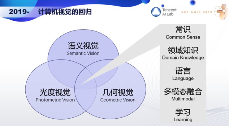 我认为接下来应该要回归初心,让光度视觉、几何视觉和语义视觉紧密结合起来,同时注入常识和领域知识,和语言进行多模态融合,通过学习不断演变。