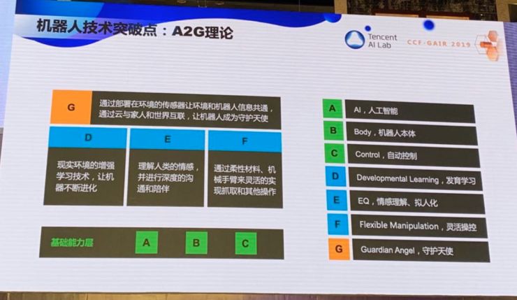 在机器人领域,我提出了 A2G 理论。A 是 AI,机器人必须能看能听能说能思考,B 是 Body 本体,C 是 Control 控制,ABC 组成了机器人的基础能力。D 是 Developmental Learning,发育学习,E 是 EQ,情感理解、拟人化,F 是 Flexible Manipulation,灵活操控。最后要达到 G,G 是 Guardian Angel,守护天使。