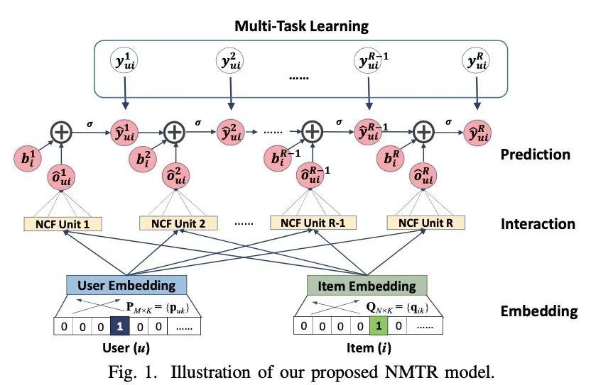 大多数现有的推荐系统只会用到用户单一类型的行为数据,例如在电子商务中的我们可能只会使用到用户购买的行为数据。但是我们认为其他类型的用户行为数据也可以提供非常有价值的信号,例如单击,加购等。本文对此提出了一种新的解决方案NMTR(Neural Multi-Task Recommendation)来学习用户的多行为数据。