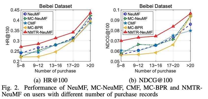 从上面的图上,我们发现NMTR在HR@K和NDCG@K的效果是最好的,NMTR-GMF和NMTR-NeuMF比NMTR-MLP要更好。