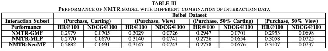 和最佳的单行为的baseline NeuMF,NMTR的效果在Beibei数据集上的效果在HR上要好了9.01%,在NDCG的数据集上要好了6.72%。