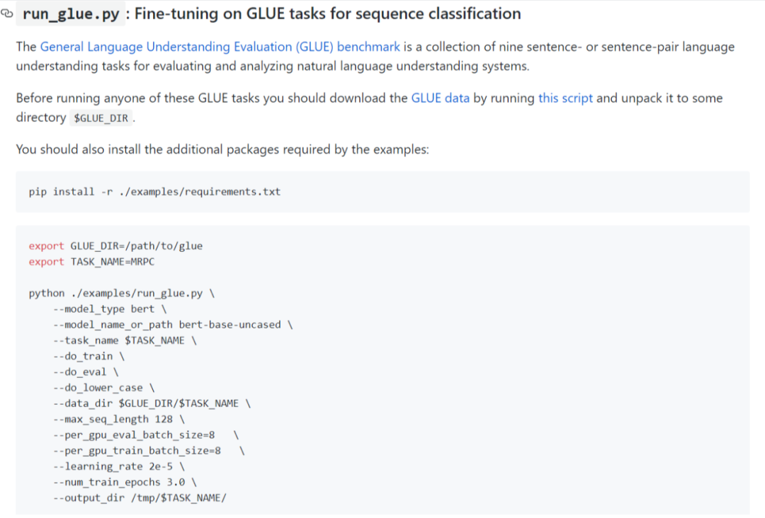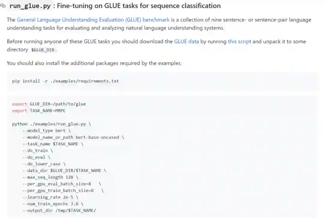 如果你想在一些NLP常用数据集上复现BERT的效果,Transformers上也有现成的代码和方法,只要把数据配置好,运行命令即可,而且finetune的任务可以根据你的需要切换,非常方便。