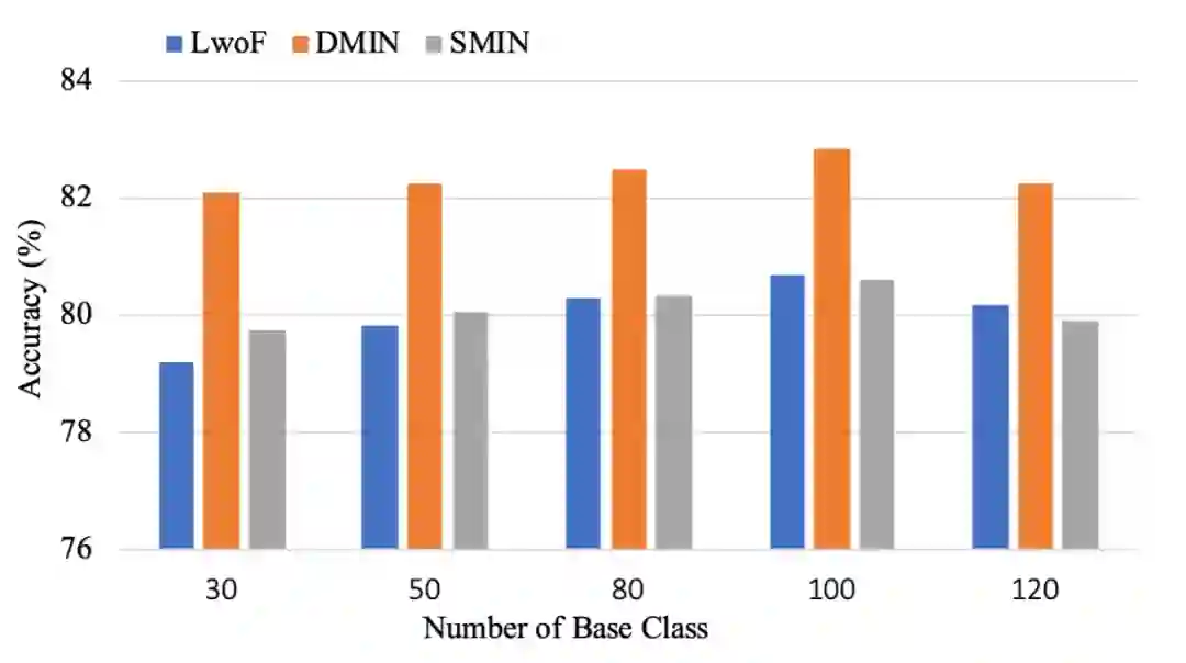 ▲ 图8 DMM模块分析 我们在 ODIC 数据集上变化监督学习阶段 base 类别的数量,然后观察其对小样本学习结果的影响,图 9 可以发现当 base 类别从 30 增长到 100 的时候,由于在监督学习阶段学到了更强的文本 embedding 特征,最终结果是随着 base 类的数量而提升的。但是在 base 类为 120 的时候出现下降,这是由于 unseen 类别的占比太低的时候,模型整体对 unseen 类别的识别能力也会受到影响。