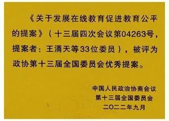 中国图象图形学学会副理事长、北京理工大学王涌天教授领衔提出的《关于发展在线教育促进教育公平的提案》被评选为政协第十三届全国委员会优秀提案。