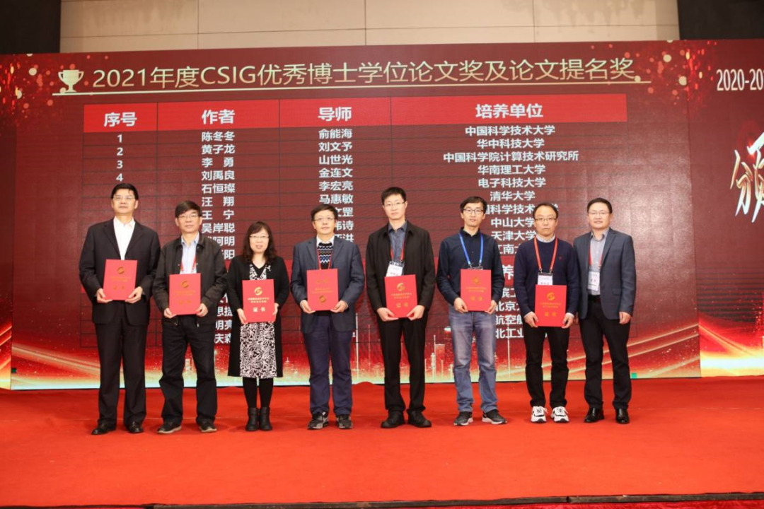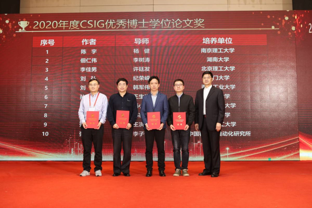 2020和2021年度共有24位青年学者获得优秀博士学位论文奖和优秀博士学位论文提名奖,学会副理事长俞能海教授、王亮研究员、大会赞助商嘉宾阿里集团贾荣飞先生、华为于璠先生、360集团邓亚锋先生、百度丁二锐先生分别为获奖者颁发荣誉证书。