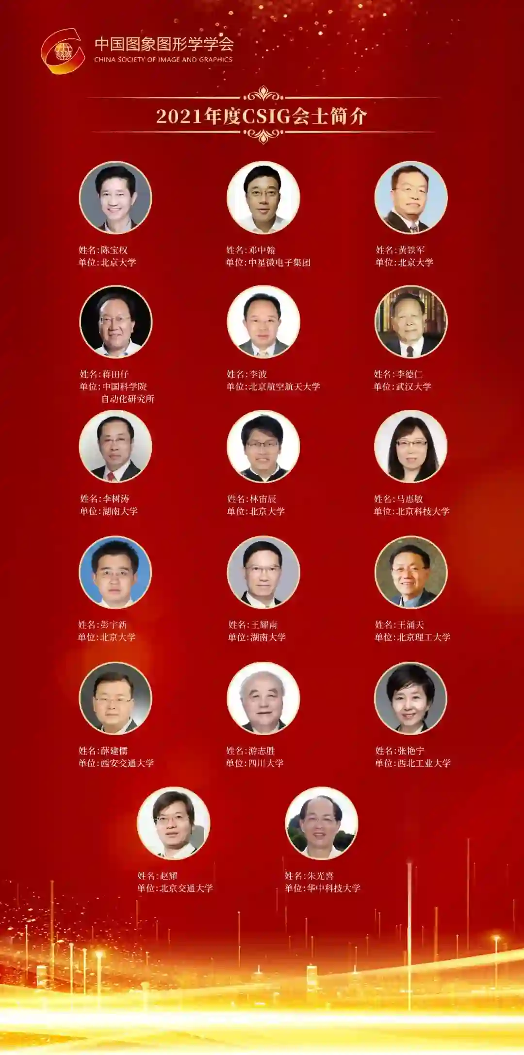 中国图象图形学学会会士是本学会最高学术荣誉,以表彰在图像图形科学技术领域取得卓越成就和为学会作出突出贡献的学会会员。2021年17位学者当选中国图象图形学学会会士,学会首届会士、副理事长赖剑煌教授、俞能海教授为当选会士颁发荣誉证书。