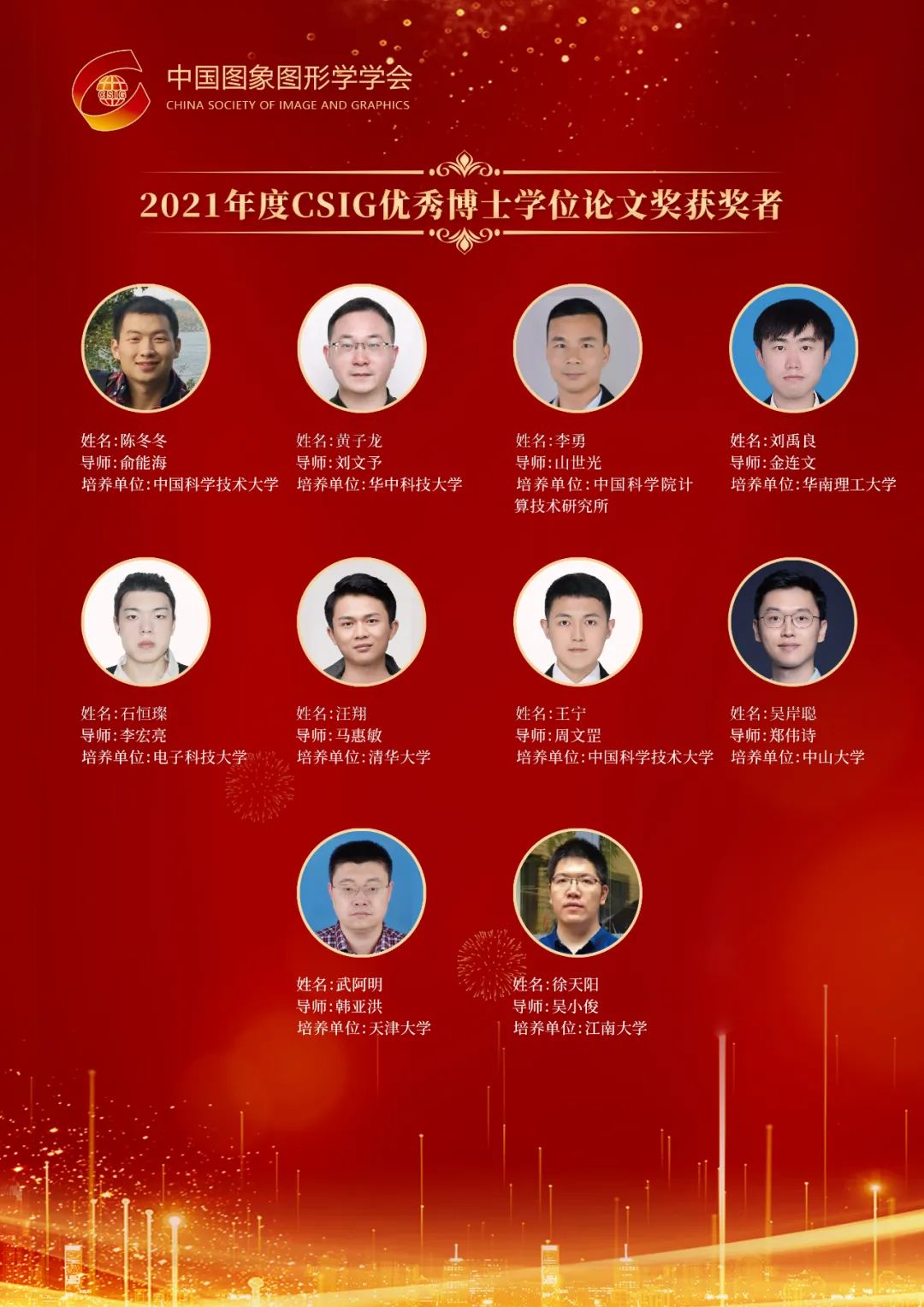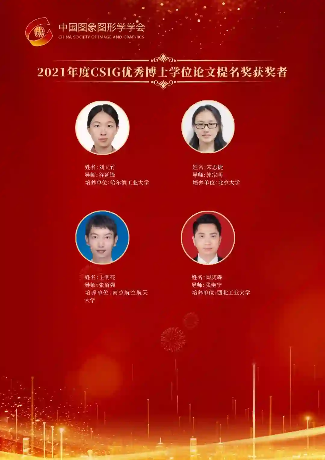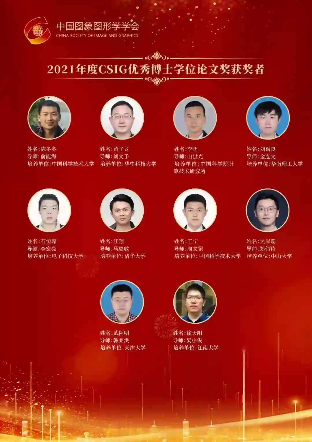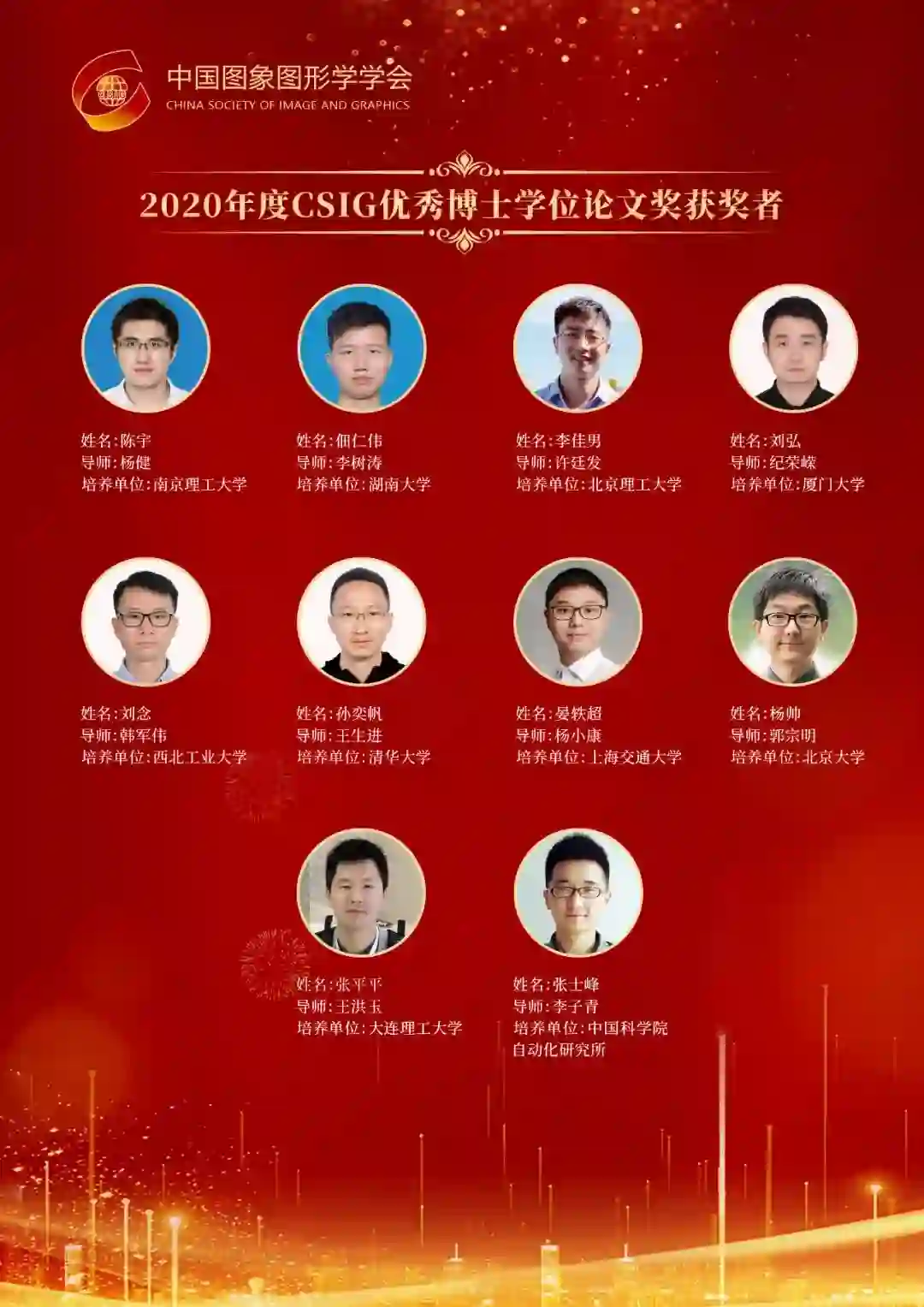 学会于2017年设立优秀博士学位论文奖,授予在攻读博士学位期间,在图像图形及其相关领域的基础理论或应用研究中取得重要成果,或在关键技术或应用技术创新等方面成果显著的论文作者。