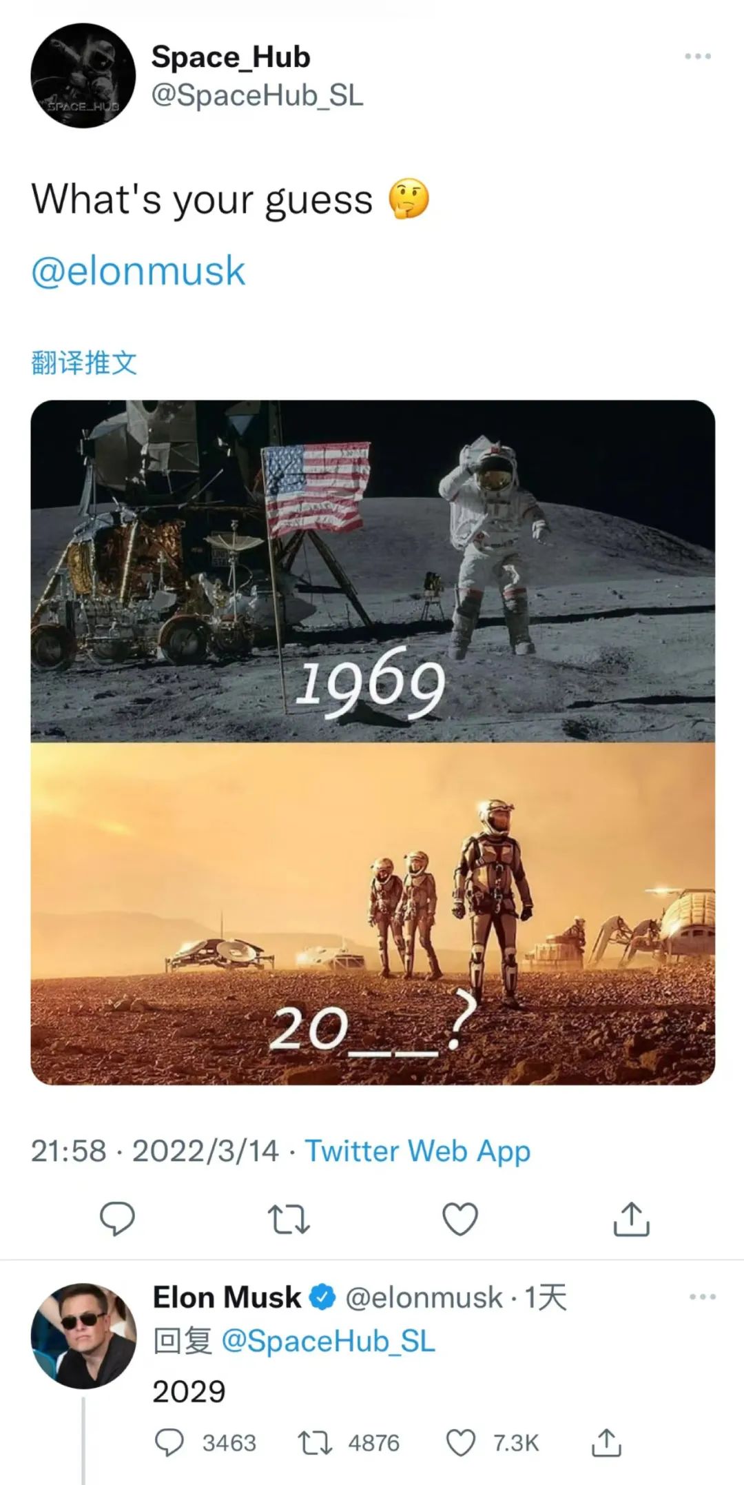 【马斯克暗示2029年登陆火星,曾表示要将100万人送往火星】