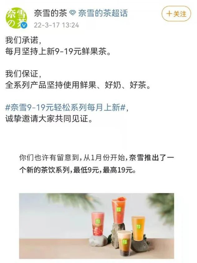 奈雪的茶宣布大幅降价,推出9-19元“轻松系列”鲜果茶。奈雪的茶承诺,不超20元的茶饮每月都上新产品。推出低价系列的同时,多款产品价格下调,当前菜单上已没有“3字头”产品。(观察者网)