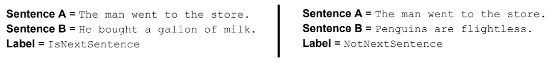 BERT 还学习如何建模句子之间的 关系,通过预训练对任何文本语料库都可生成的一个很简单的任务来实现:给定两个句子 A 和 B,判断 B 是在语料库中 A 之后实际出现的下一个句子,或者只是一个随意的句子?例如: