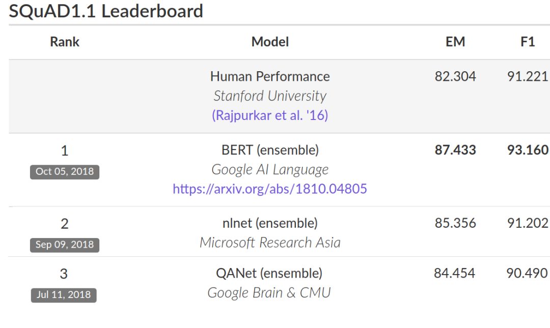为了评估性能,我们将 BERT 与其他最先进的 NLP 系统进行了比较。需要注意的是,在我们的实验中,我们几乎没有针对特定任务而对神经网络架构进行更改。在 SQuAD v1.1 上,BERT 获得了 93.2% 的 F1 分数(一种准确度的衡量指标),超过了之前最高水准的分数 91.6% 和人类分数 91.2%: