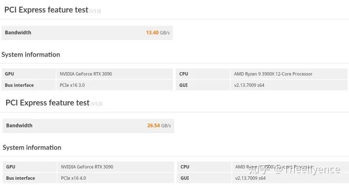 在上篇文章里,测试结果表明RTX3080并不需要PCIe 4.0×16的加持,PCIe 3.0×16就足以使其完整发挥性能,RTX3090应亦如是?