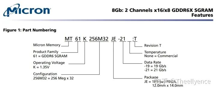 美光目前有两种GDDR6X颗粒,但需要去翻阅产品目录并下载Datasheet,美光官网的FBGA Decoder没有收录它们的信息,这里给出Datasheet附带的型号解读方法,自行参考即可: