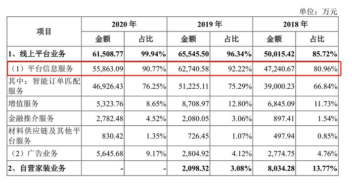 2018年-2020年,土巴兔营收5.83亿元、6.8亿元、6.15亿元,净利润达0.39亿元、0.80亿元、0.87亿元,营收大头还是在信息撮合上。