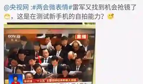 某年春天,他去开央视都要播出的会议时,都不忘拿出自己手机自拍。搞得央视网官微都调侃雷军:“雷军又找到机会抢镜了。”