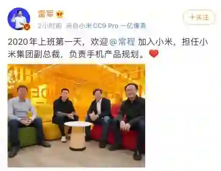 2日上午,雷军微博官宣,欢迎原联想集团副总裁常程,入职小米,担任小米集团副总裁。