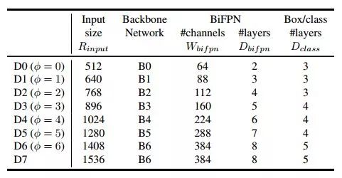 利用上面的公式,我们得到了EfficientDet-D0 (φ = 0) to D6 (φ = 6)。作者称φ = 7时,训练时内存不够,除非改变batch size,为了保持一样的training settings,仅扩展输入分辨率来得到EfficientDet-D7。下表是EfficientDet-D0 to D7的配置: