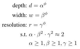 指明有多少资源可用,而α,β,γ指定如何分配这些资源给网络宽度,深度和分辨率。网络深度增加一倍,FLOPS变为之前的两倍;网络宽度和分辨率增加一倍,FLOPS变为之前的四倍,所以上述操作将使得FLOPS变为之前的