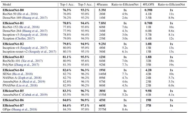 例如:66M parameters,37B FLOPS 的 EfficientNet-B7 达到了84.4% top1 / 97.1% top-5 accuracy,比之前最高精度的GPipe还高,而且比GPipe的参数量小8.4倍。