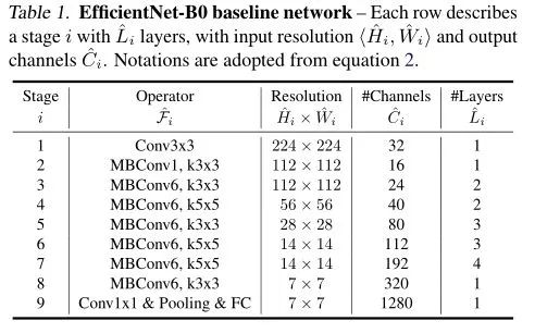 作者以MobileNet v2中的MBConv + squeeze-and-excitation optimization作为基本构建模块,利用论文《MnasNet: Platform-aware neural architecture search for mobile》中提出的NAS方法(此处将 作为优化目标),搜索到一个efficient network,作者为其取名 EfficientNet-B0,并将它作为后续的baseline network。