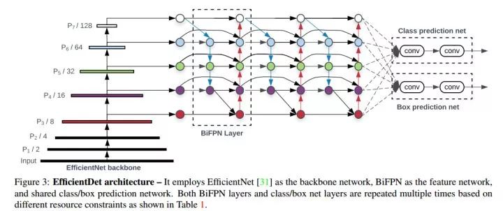 采用EfficientNet作为backbone;堆叠BiFPN Layer来获得高级别的融合特征;box/class network可以共享所有级别的特征。