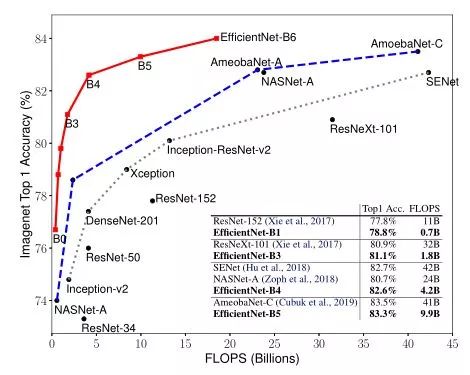 例如:EfficientNet-B3达到了比ResNeXt-101还高的精度,同时参数量比后者小18倍。