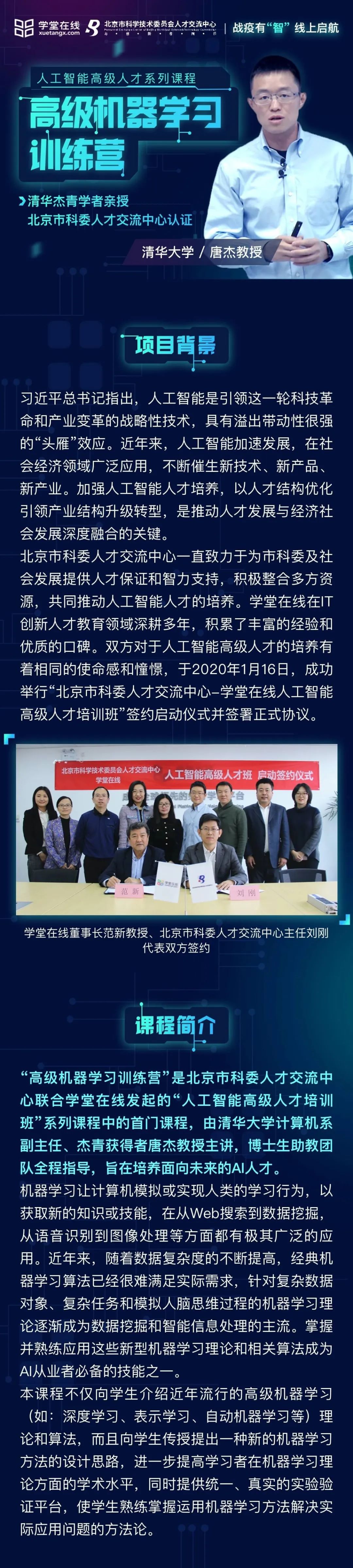 近年来,人工智能加速发展,在社会经济领域广泛应用,不断催生新技术、新产品、新产业。加强人工智能人才培养,以人才结构优化引领产业结构升级转型,是推动人才发展与经济社会发展深度融合的关键。2020年1月16日,“北京市科委人才交流中心-学堂在线人工智能高级人才培训班”签署了合作协议,