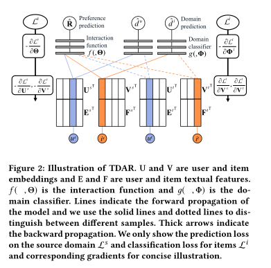 摘要:在推荐系统中,数据稀疏是一个固有的挑战,其中大部分数据都是从用户的隐式反馈中收集的。这给设计有效的算法带来了两个困难:第一,大多数用户与系统的交互很少,没有足够的数据可供学习;第二,隐式反馈中没有负样本,通常需要进行负采样来生成负样本。然而,这会导致许多潜在的正样本被错误地标记为负样本,而数据稀疏会加剧错误标记问题。为了解决这些困难,我们将稀疏隐式反馈推荐问题看作一个半监督学习任务,并探索领域自适应来解决这个问题。我们将从密集数据中学到的知识转移到稀疏数据中,并将重点放在最具挑战性的案例âĂŤ上,该案列没有用户或项目重叠。在这种极端情况下,由于两个潜在空间编码的信息非常不同的,直接对齐两个数据集的嵌入是相当次优的。因此,我们采用领域不变的文本特征作为锚点来对齐潜在空间。为了对齐嵌入,我们提取每个用户和项目的文本特征,并将它们与用户和项目的嵌入一起馈送到领域分类器中。通过训练嵌入来迷惑分类器,并将文本特征固定为锚点。通过域自适应,将源域中的分布模式转移到目标域。由于目标部分可以通过领域自适应进行监督,因此我们放弃了对目标数据集的负采样,以避免标签噪声。