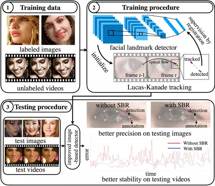 Supervision-by-Registration(SBR) 是一个训练人脸关键点检测器的算法框架,能够利用无监督的方式增强任何基于图像的人脸关键点检测器。SBR 利用了物体在视频中的运动比较平滑的特性来提升一个现有的人脸关键点检测器。相比较其他人脸关键点检测算法,SBR 不需要利用任何额外的人工标注信息就能提升检测器的性能。下图是 SBR 的框架示意图。
