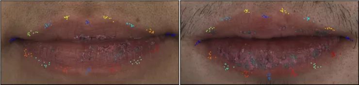 目前训练 CNN 模型需要大量的标注数据。然而标注大量的数据需要消耗很多的人力资源,并且人工标注往往不准确。如下图所示是在两张嘴的图片上标注 16 个关键点的位置,一个颜色表示一个关键点,我们给出了九个标注人员的标注结果,可以发现每个标注人员对关键点的定位方差很大。这些标注误差对训练和测试模型会有很大的影响。因此,我们就想能不能使用一种不需要人工标注的监督信息来训练 CNN 模型?基于这个目的,我们提出了 supervision be registration,利用视频里相邻帧间时序一致性来作为监督信息。