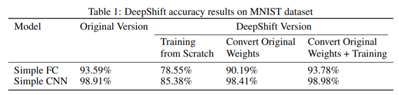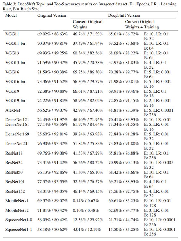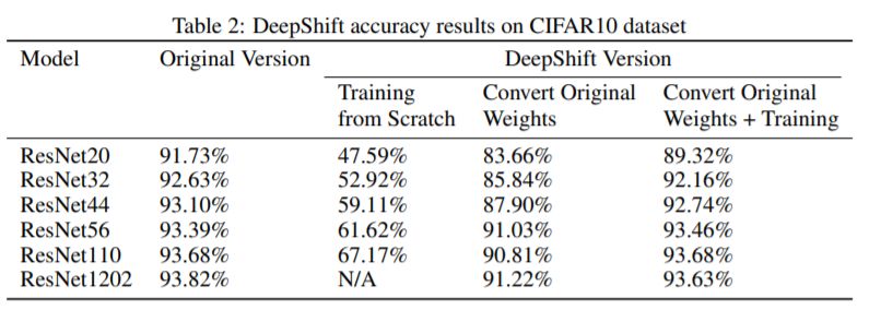 利用无需乘法即可实现的DeepShift模型,研究人员在CIFAR10数据集上的准确度高达93.6%,在Imagenet数据集上的Top-1 / Top-5准确度高达70.9%/ 90.13%。