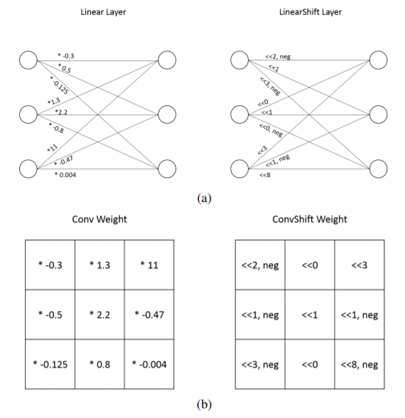 本文通过引入两个新的运算来解决这个问题:及卷积移位和全连接移位,这两种运算代替乘法,并用按位移位和按位求反。这套神经网络体系结构称为DeepShift模型。