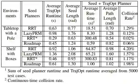 表2 “SAMPLING-BASED SEED +TRAJOPT”规划方法组合的性能评估。