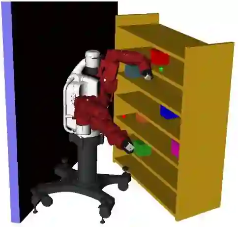 图1 实验环境图,本文选取了4个有代表性的场景:“tabletop with a pole”, “tabletop with a container”, “kitchen”, “shelf with boxes”(上图中场景)来测试不同路径规划方法的性能。