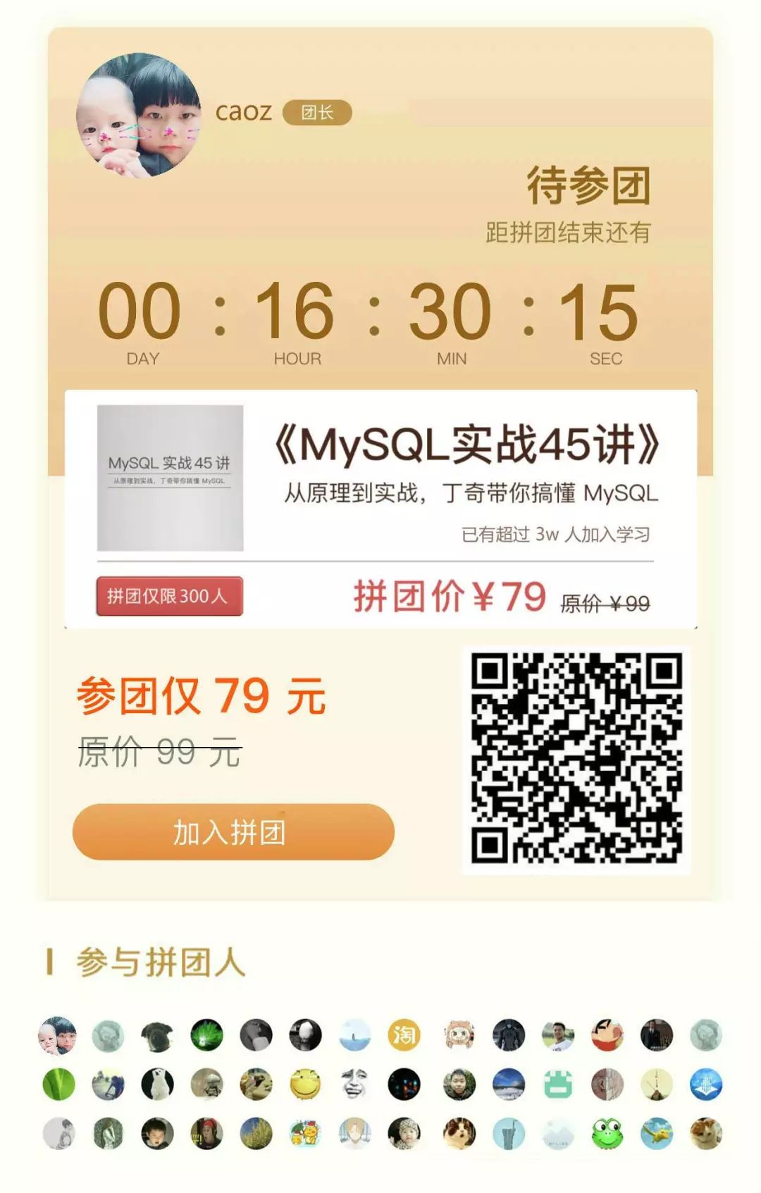 最后,再强调一遍,caoz的《MySQL实战45讲》限时24小时超级团,立省20元,只要79元,已有超过3w人加入学习,想汲取行业大佬十年心法、认真学好MySQL的同学,请抓紧搭上这趟末班车。