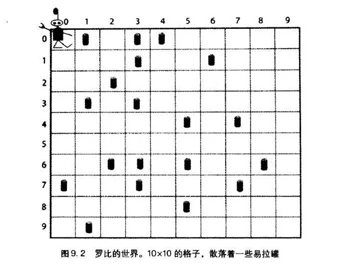 举个例子,清扫机器人罗比。它是一个可简单而详细阐述遗传算法思想的例子。我们看到下图的罗比,身处一个10*10的二维世界,同时周边随机散布着待清扫的罐子。罗比只能看到五个方向(东南西北中),只能有七个动作(向东移动、向南移动、向西移动、向北移动、随机移动、不动和清扫罐子)。移动并清扫一个罐子得10分,移动但没扫到罐子扣1分,撞墙扣5分,每次清扫,罗比会进行200个动作,这样总分会是500分。我们用传统策略(有罐子就清扫,然后就往有罐子的方向上移动并清扫,否则就随机移动)测试10000次后,得到的平均分是346。