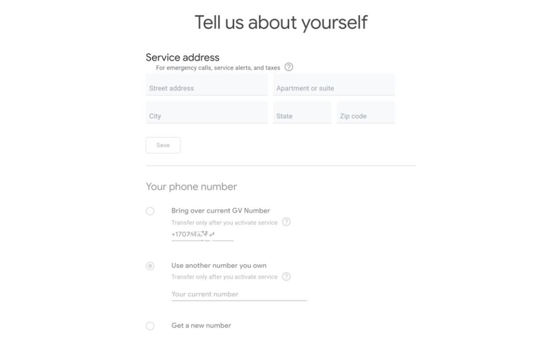 选择好资费套餐后(其实就一种,根本没得选)就要填写服务地址并选择手机号码了,需要注意的是,服务地址的不同会导致 Fi 每月通讯账单中的税费不同,可以选择税费较低的州;手机号码的选择就比较多了:既可以直接沿用谷歌账号已有的 GV 号,也能将手上美帝的电话号码进行携号转网,或者重新申请一个新的号码。然后下一步绑定支付使用的信用卡即可(已经在账号中绑定过的可以直接使用)。