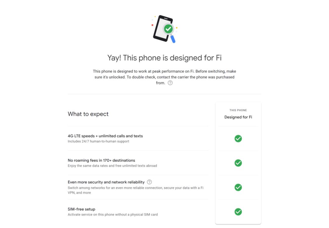 选好用来开通 Google Fi 的 Pixel 3,网站接下来便会提示你的机器是 designed for Fi 的,其中除了共有的 4G 速度、无漫游资费等特点外,所有 designed for Fi 的机型还都支持 Google 的加密网络,Pixel 2/Pixel 3 系列更可以凭借 SIM-free setup 特性直接进行 eSIM 激活,不需要额外申请寄送实体 SIM 卡。