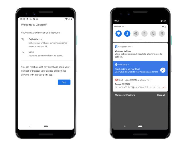 注册完成后我们就可以换用 Pixel 3 激活了。首先我们需要前往 Play 商店下载 Google Fi 这个 App(提醒一下,仅在美区上架),连上 Wi-Fi 并按照指示选择好谷歌账号,然后不停下一步、下一步就行了——最后看到通知栏出现 Welcome to China,就表示成功激活了。