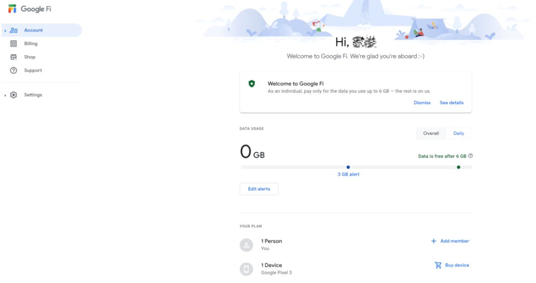 申请完后就能看到管理页面了,目前页面上没有对应的机器,可以看到 Welcome to Google Fi 以及提醒去设置手机进行激活。