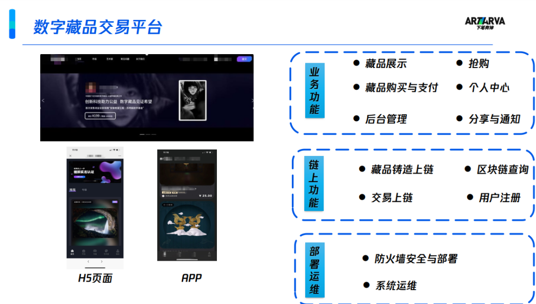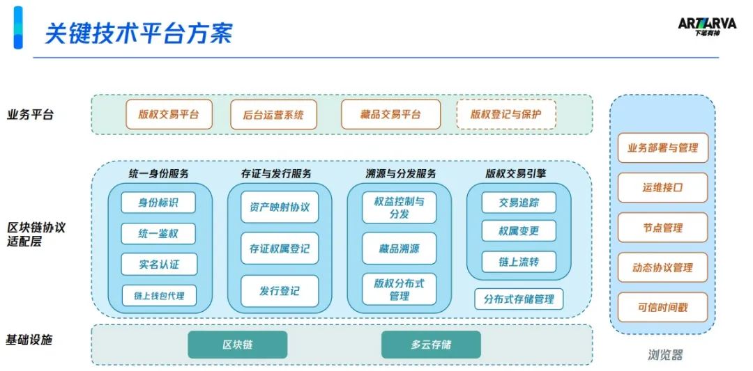 一个典型数字藏品交易平台的技术基础是底链,产品体现为 PC 端、H5 端和 App 端,业务功能包括藏品展示、抢购、藏品购买与支付、个人中心、后台管理和分享与通知。当然,实际上,产品形态丰富,玩法多样,比如定价购买、抢购、拍卖、盲盒和资产合成。链上功能则包括藏品铸造上链、区块链查询、交易上链和用户注册。从技术角度看,整个数字藏品交易平台按分层划分,上层是业务平台,包含版权交易平台、后台运营系统、藏品交易平台和版权登记与保护。底层基础设施主要依靠 TBaaS 长安链平台,以及其他基于多云的分布式存储的支撑。而中间则是纪震寰他们花费主要精力构建的区块链协议适配层,它分为统一身份服务、存证与发行服务、溯源与分发服务、版权交易引擎。