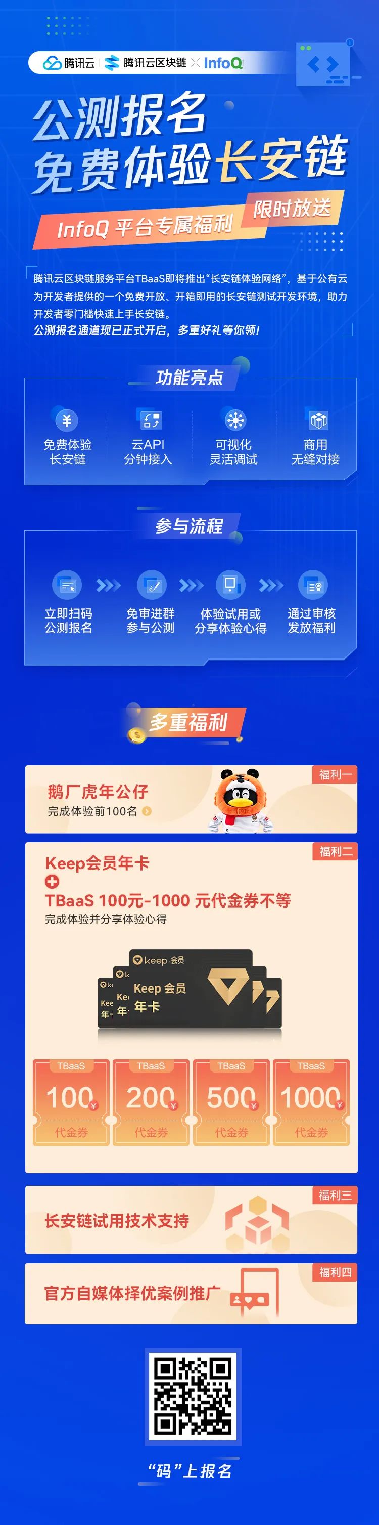 当前,TBaaS 长安链体验网络火热公测中。想更轻量试水长安链?想零门槛免费体验长安链?想开发自己的区块链应用?即可参与 TBaaS 长安链体验网络试用,还可获得惊喜福利:福利一,前 100 名完成试用,获得【鹅厂虎年公仔】;福利二,完成试用,并分享体验心得,可获【Keep 会员年卡】+【100-1000 元 TBaaS 代金券】。