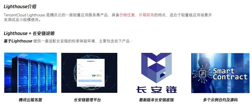 为进一步降低门槛,便于广大开发者使用长安链,Lighthouse 成为更合适的方式。作为腾讯云一款轻量应用服务器产品,Lighthouse 具备价格优惠、开箱即用的特点。